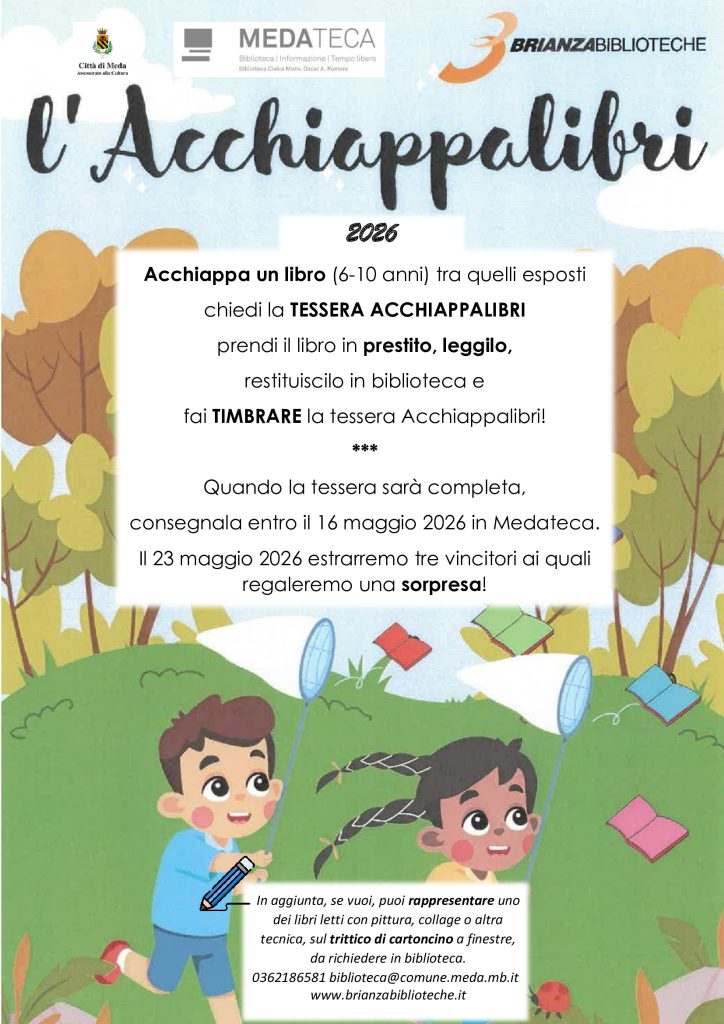 Si invitano gli alunni della scuola Primaria a partecipare all’iniziativa “Acchiappalibri 2026”, rivolta a bambini dai 6 ai 10 anni e promossa da Brianzabiblioteche, a cui aderisce anche la Biblioteca di Meda.