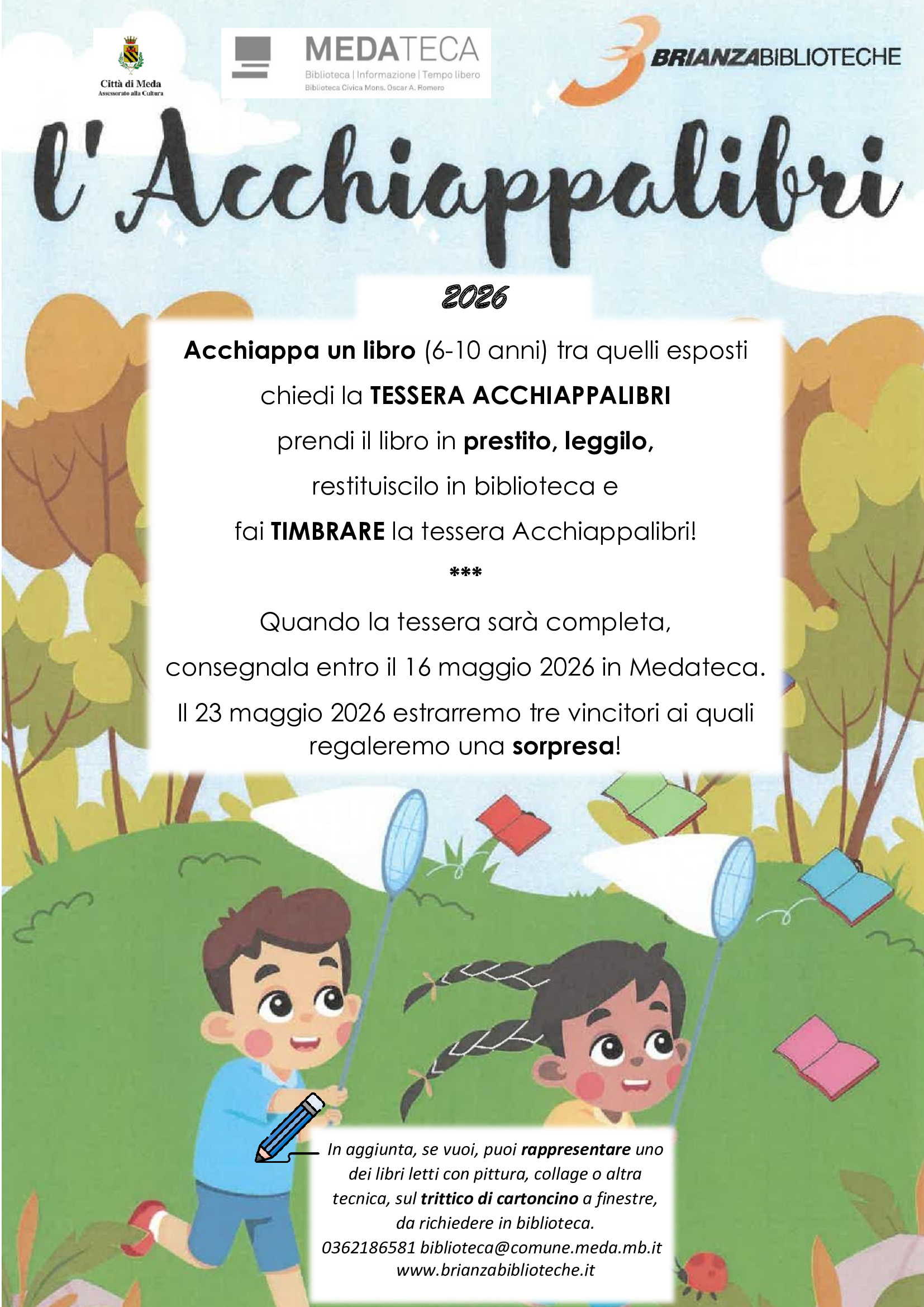 Si invitano gli alunni della scuola Primaria a partecipare all’iniziativa “Acchiappalibri 2026”, rivolta a bambini dai 6 ai 10 anni e promossa da Brianzabiblioteche, a cui aderisce anche la Biblioteca di Meda.