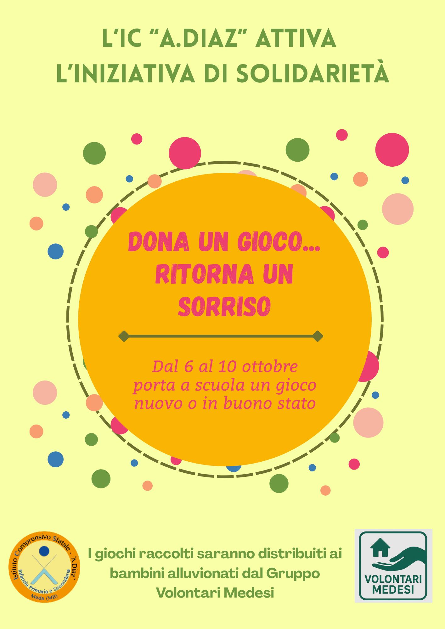A seguito dell’alluvione che ha recentemente colpito la nostra città e per far sentire la nostra vicinanza ai bambini che hanno perso i loro piccoli tesori, il nostro Istituto Comprensivo attiverà l’iniziativa di solidarietà “DONA UN GIOCO…RITORNA UN SORRISO”.